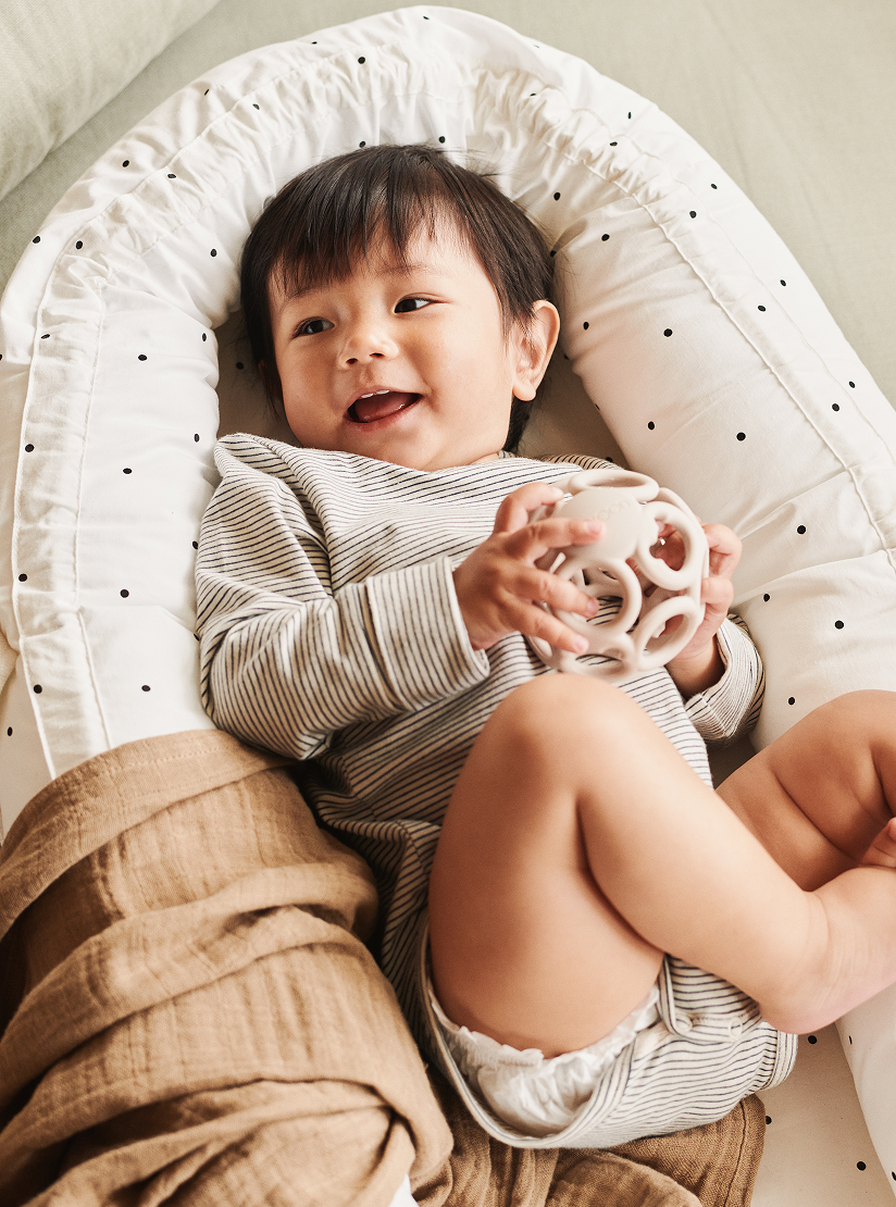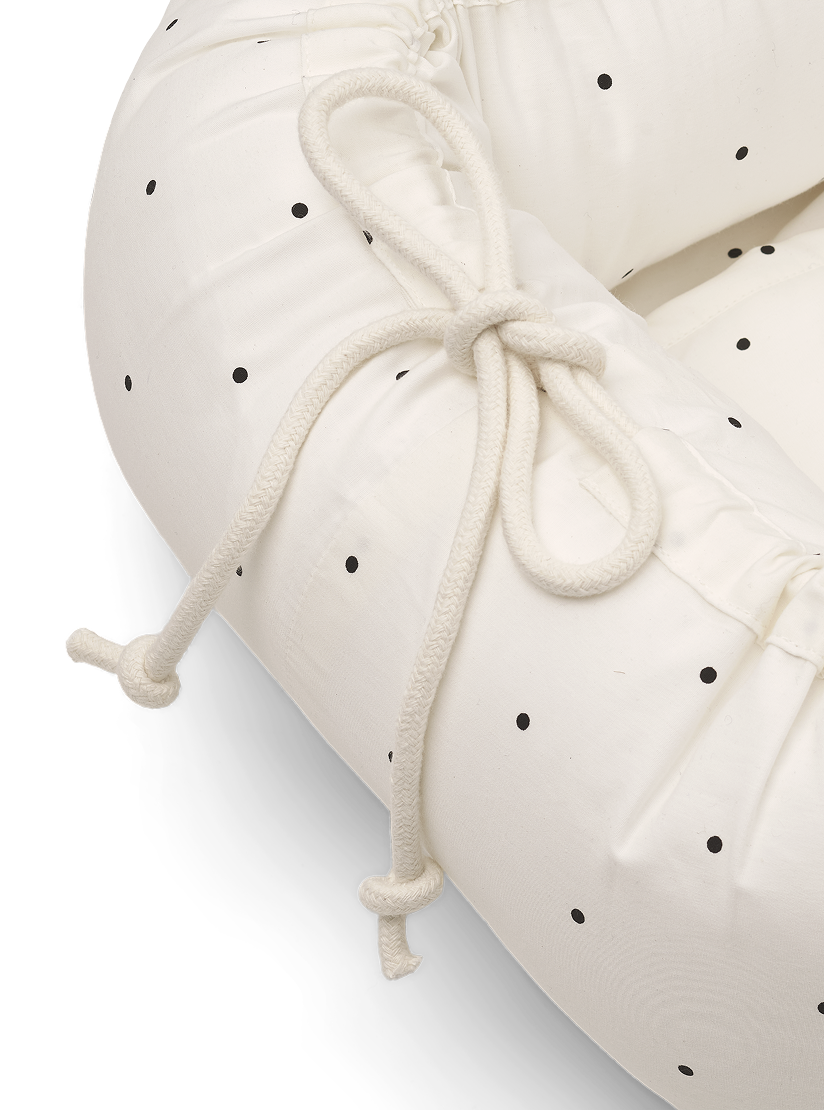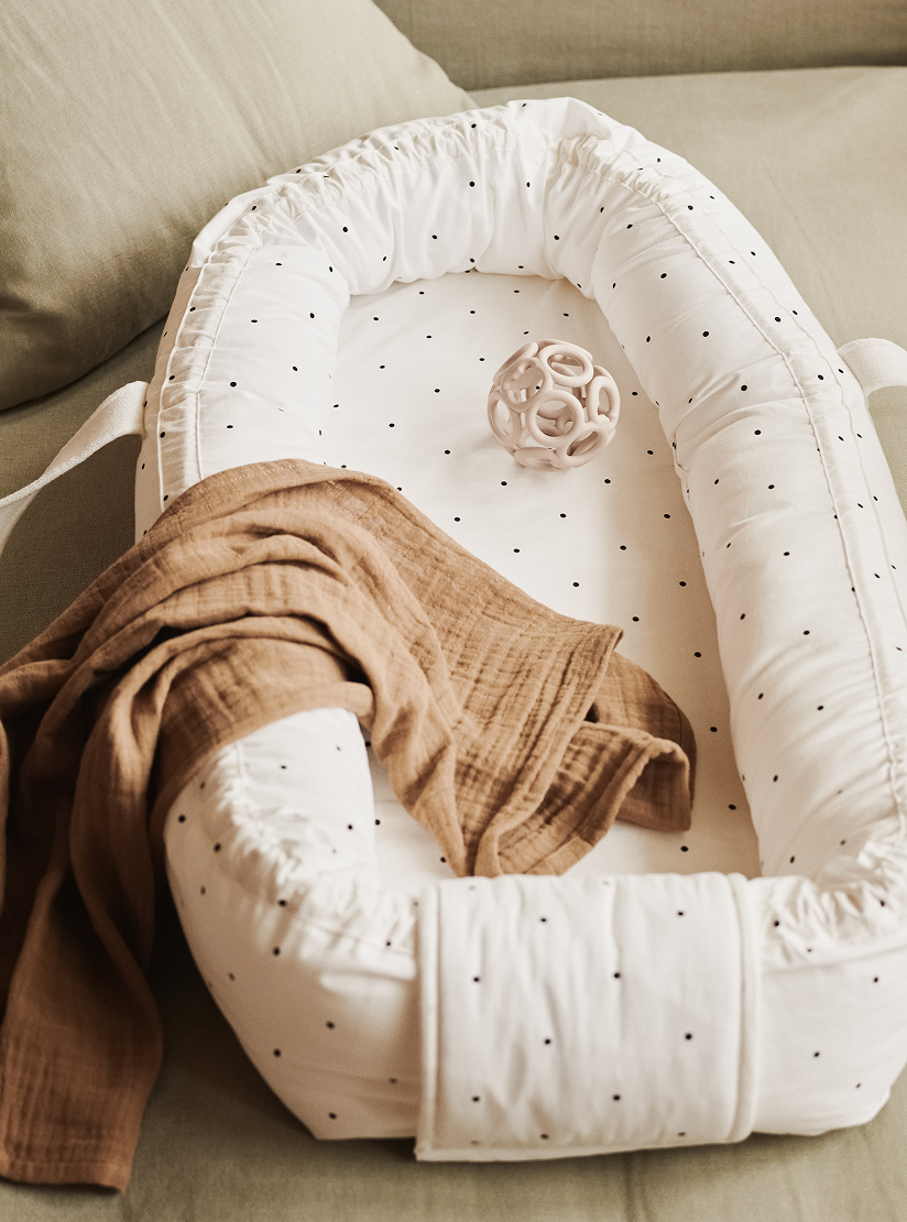 Die ultimative Verbindung von Baby-Lift und Nest mit Griffen für einfache Mobilität. Die Füllung, die Matratze und das Holzbrett sind abnehmbar, sodass der Bezug waschbar ist.